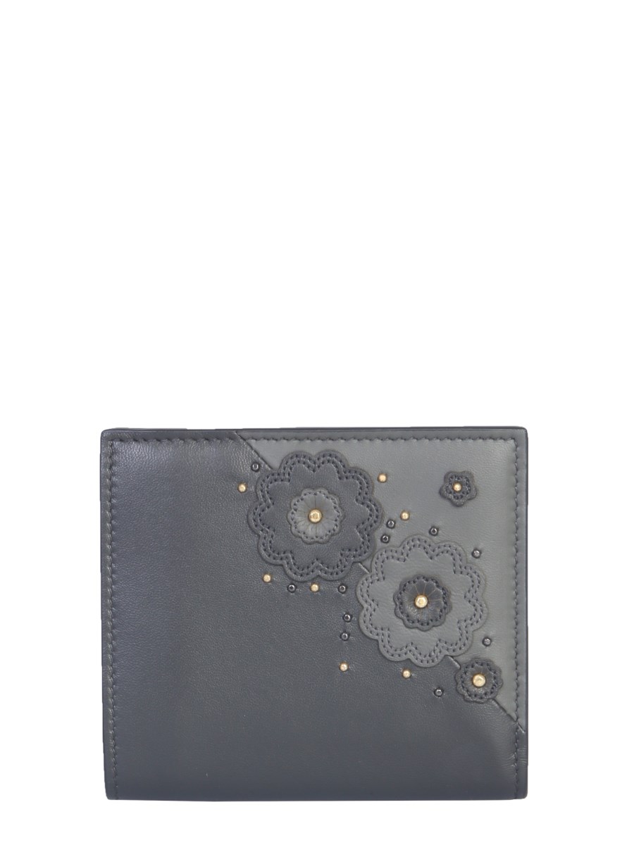 - CHIUSURA CON BOTTONE A PRESSIONE - UNA TASCA PER MONETE CON ZIP - UNA TASCA PER BANCONOTE - OTTO SCOMPARTI PER CARTE - APPLICAZIONI FIORI CON BORCHIE FRONTALE - DIMENSIONI: A 10 CM X L 11 CM X P 3 CM - 100% PELLE- MADE IN ITALY